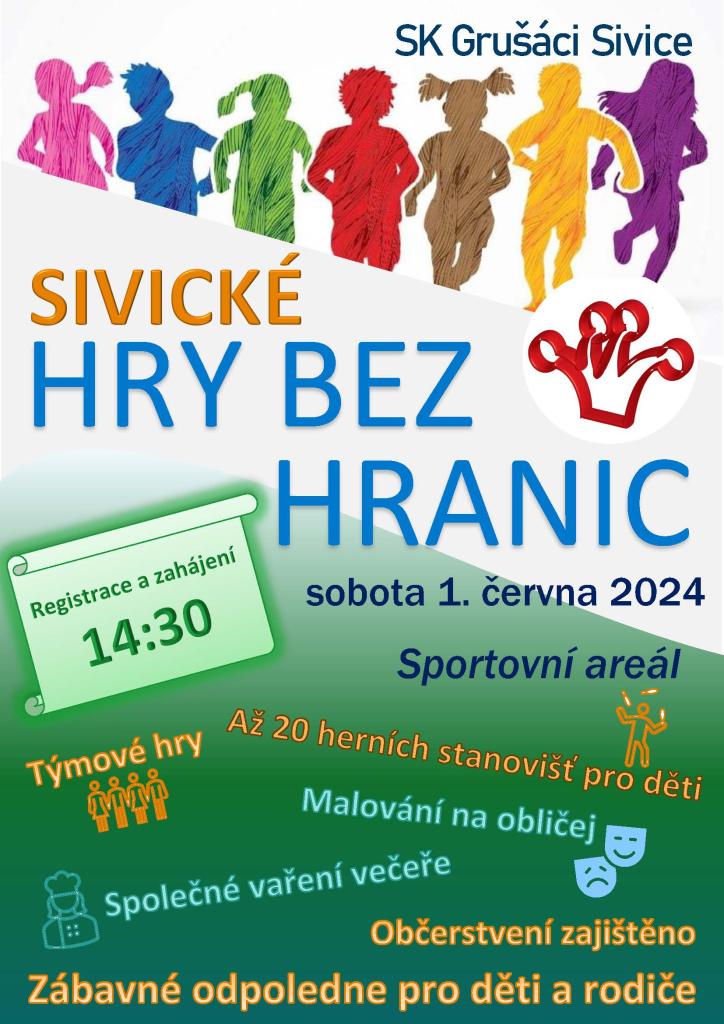 Sportovní klub Grušáci vás srdečně zve v sobotu 1. června 2024 na Sivické hry bez hranic, zábavné odpoledne pro děti i rodiče. Registrace a zahájení ve 14:30 hodin ve Sportovním areálu. Můžete se těšit na týmové hry, malování na obličej nebo na společné vaření večeře. Občerstvení zajištěno.
