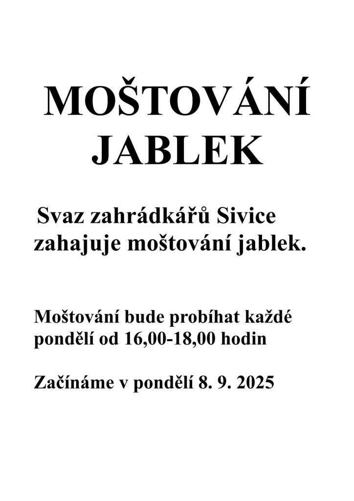 Svaz zahrádkářů Sivice zahajuje moštování jablek. Moštování bude probíhat každé pondělí v době 16 – 18 hodin. Začíná se od pondělí 8. 9. 2025.