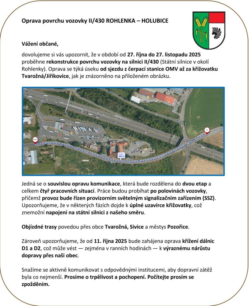 Oprava povrchu vozovky II/430 ROHLENKA – Holubice