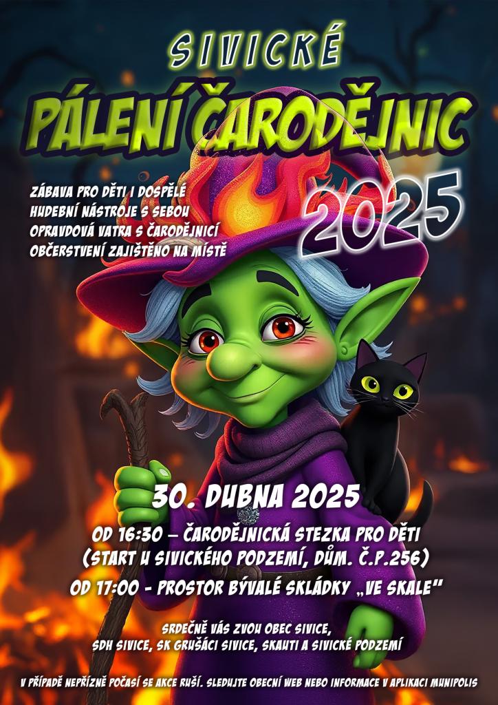 Již od 16:30 h začíná čarodějnická stezka pro děti (start u sivického podzemí, dům č. p. 256). Těšit se můžete na zábavu pro děti i dospělé a opravdovou vatru s čarodějnicí. Hudební nástroje jsou vítány. Občerstvení zajištěno. V případě nepříznivého počasí se akce ruší. Sledujte obecní web nebo informace v aplikaci munipolis.