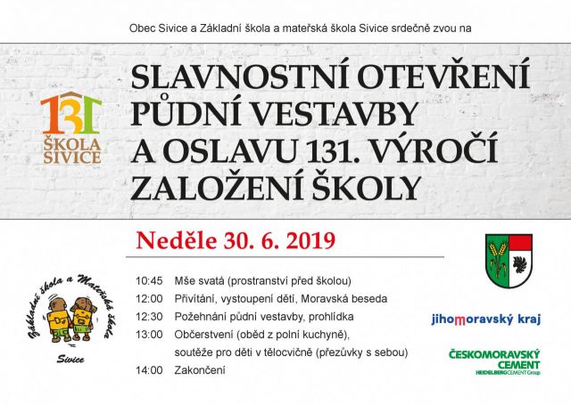 Obec Sivice a ZŠ a MŠ Sivice, vás srdečně zvou v neděli 30. 6. 2019 na slavnostní otevření půdní vestavby a oslavu 131. výročí založení školy.