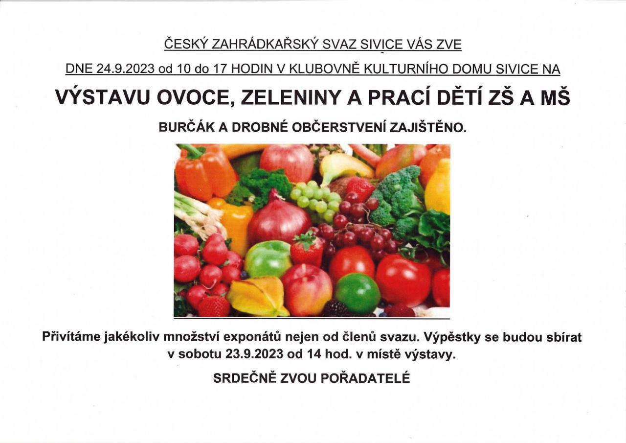 Český zahrádkářský svaz vás zve na výstavu ovoce a zeleniny a prací žáků MŠ a ZŠ Sivice. Výstava bude otevřena v neděli 24. září 2023 od 10 do 17 hodin v klubovně kulturního domu v Sivicích.