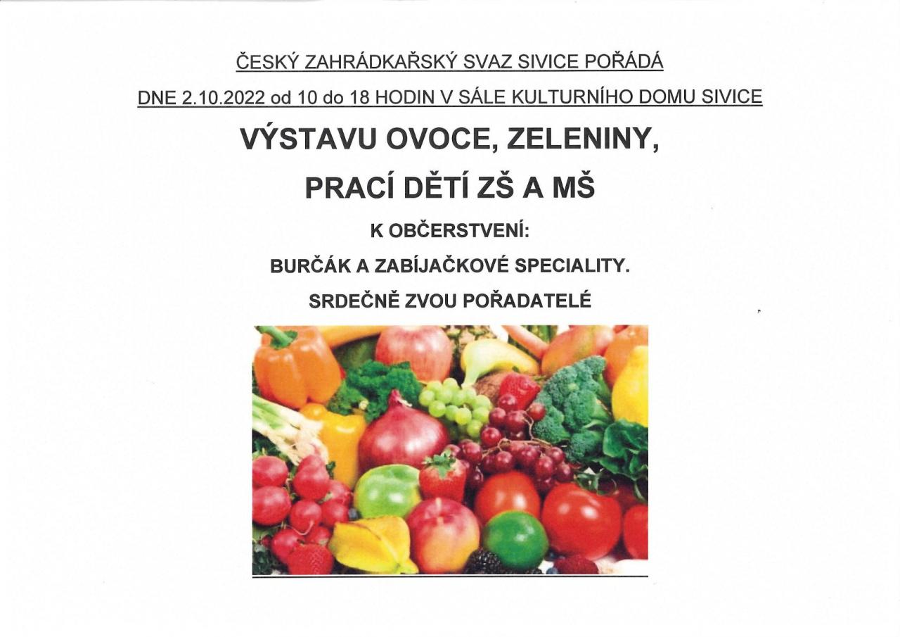 Český zahrádkářský svaz Sivice zve všechny občany na tradiční výstavu ovoce, zeleniny a prací dětí ZŠ a MŠ v neděli 2.10.2022 od 10 do 18 hodin v sále kulturního domu. K občerstvení burčák a zabíjačkové speciality.